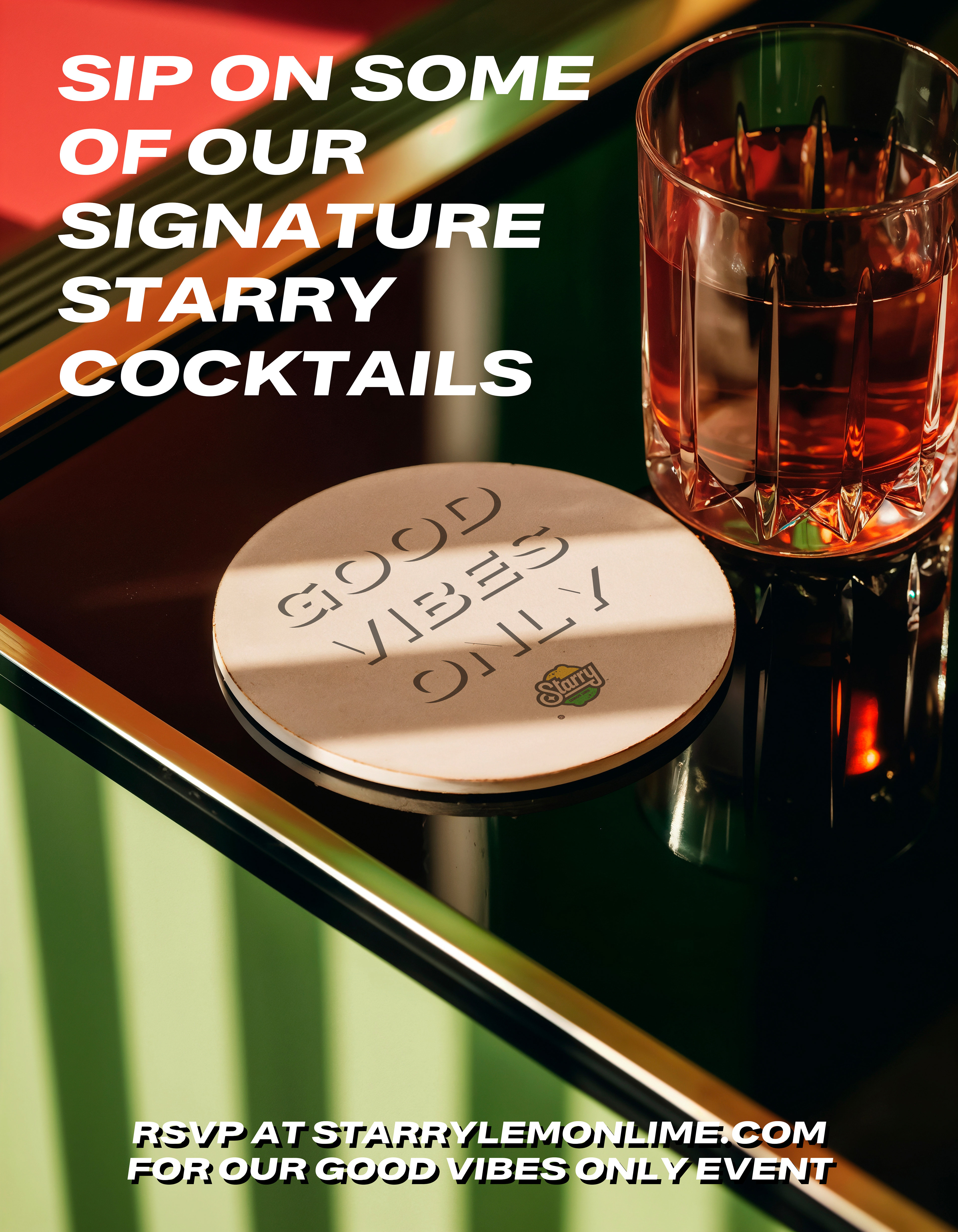 Welcome to Good Vibes Only, an event that highlights Starry's brand and would have giveaways and signature cocktails made with the soda. This event is meant to be at night on a rooftop pool and bar. The event would be promoted through social media and on banners around each city it would be happening in.
